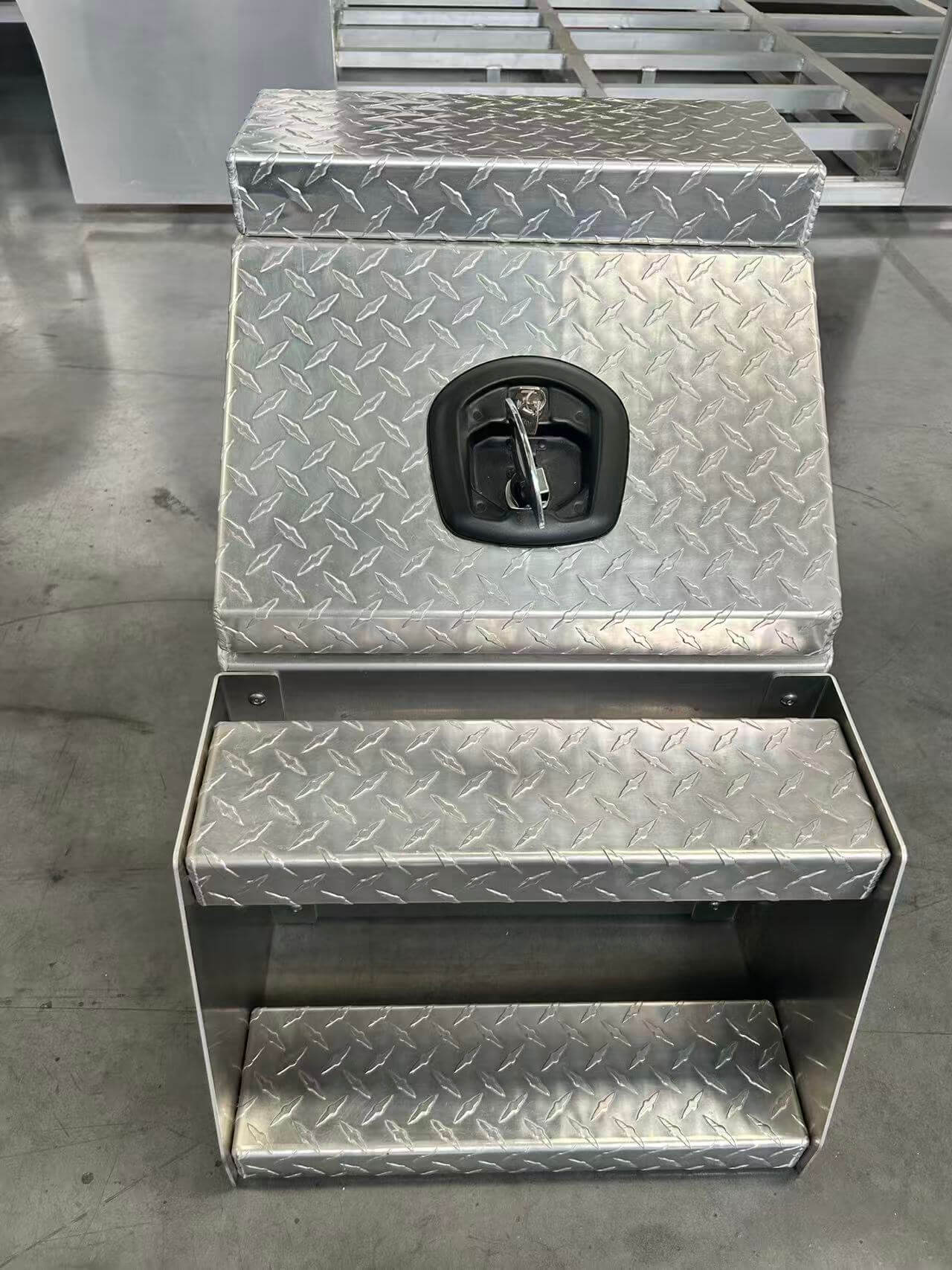 Maximize space utilization with our integrated step-and-storage design. Heavy-duty aluminum construction provides secure tool storage while the diamond-plate stepping surface ensures safe cab access in any weather condition.